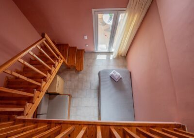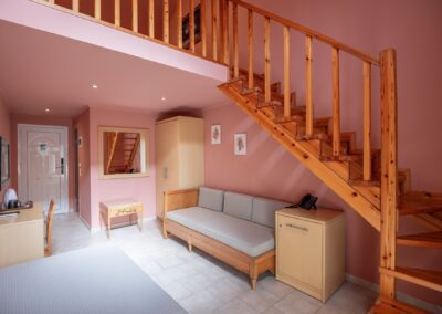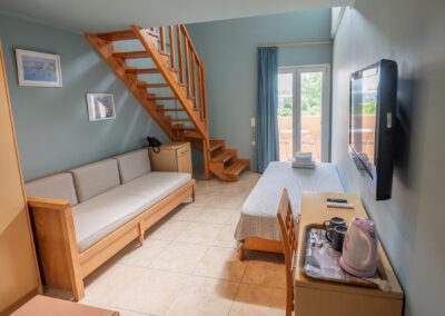 The Hotel Coral family rooms are 32 m². spaces of 8 modern furnished maisonettes that consists of two storeys, communicating through an internal staircase which have the bedroom in an upper level, a living room on the low floor with 2 sofa beds and side sea view that can accommodate up to 3 adults, or 2 adults and 2 children. They are all situated on the first floor.
